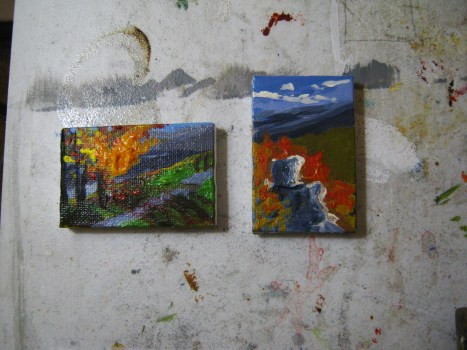 Pictured are two of my acrylic paintings, Along the Path (left), acrylic on canvas, and Wolf Rock (right), acrylic on canvas. Each painting measure 3 x 2 inches and are painted on miniature pre-primed canvases. They have been sealed with Liquitex professional gloss varnish to protect the integrity of the acrylic paints and prevent fading.