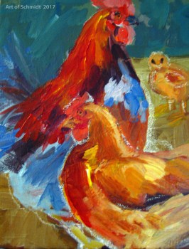 Previous Image Stage4, Rooster, Hen and chick, small Stage 4: I continued painting in the local color with Liquitex Acrylic paints until I was happy with the values and colors. Share this: Click to email a link to a friend (Opens in new window) Email TweetLike Loading...