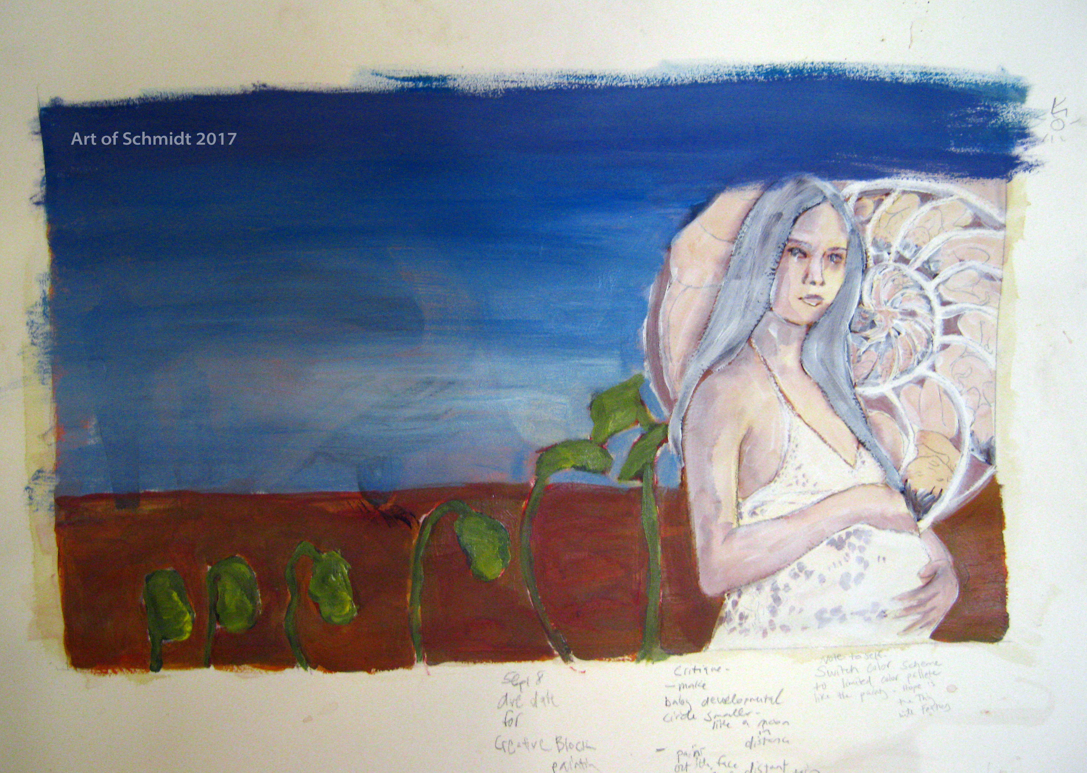 Previous Image Next Image Creative Block, revised composition Stage 4: Creative Block, Waiting, stage 4. I started to add color with acrylic paint, after the acrylic Gesso had dried. Share this: Click to email a link to a friend (Opens in new window) Email TweetLike Loading...