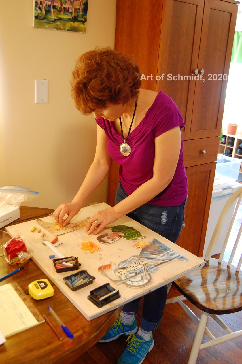 Follow her progress on this creative journey by visiting her Art of Schmidt blog, or her Instagram account, jsjschmidt2, to see her latest artwork in progress. She accepts custom art orders for human and pet portraits in oil and pastel, and has done so for many years. You can view a sampling of her work for clients and a brochure which outlines this 3 step process on her custom art page on this website. In her spare time, she keeps her skills sharp by working in a sketchbook almost daily, which often leads to ideas for new paintings or mixed media work that she finds fulfilling. Sometimes, she posts the results on Facebook or Instagram.