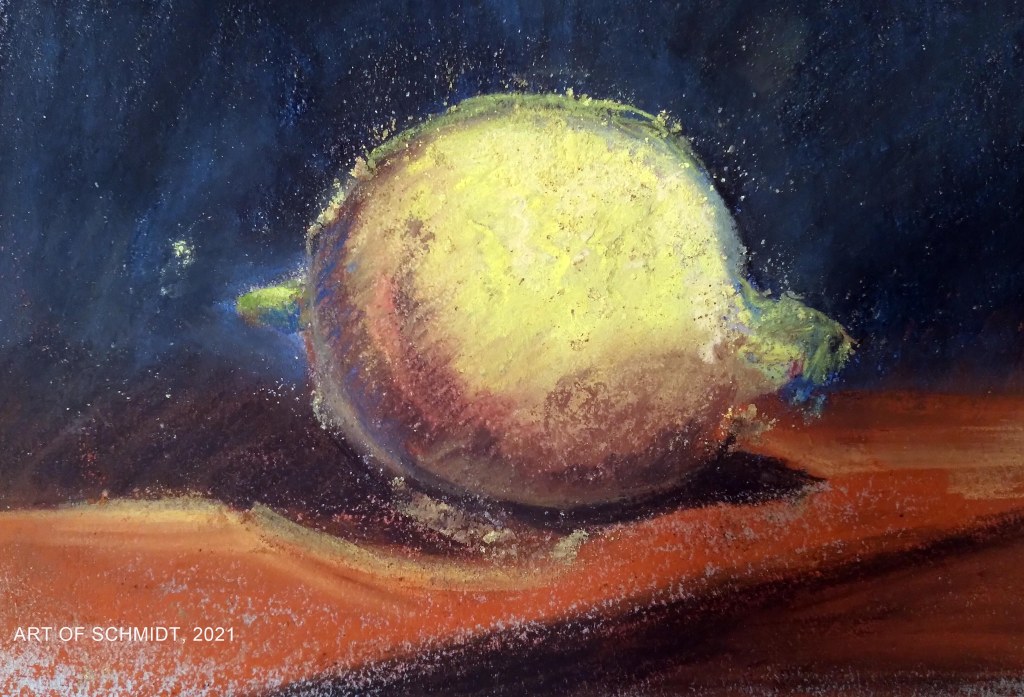 Here’s an example of a technique board, which I use to introduce students to pastel techniques, such as gradients and making linear marks. These techniques serve as a strong foundation to prepare you for the more challenging projects in still life. Example of a medium-hard pastel art tutorial in which I used blending and mark-making techniques such as scribbling. Example of a 5 value exercise I teach early in the course to teach students how to recognize value or light and shade in a still life object. Here is an example of a gradient, a wonderful exercise to learn how to shift from one value to the next, and which teaches you how to blend pastels and make softer edges. An example about how to understand the effects of light and shade on a rounded object. It’s a great exercise for beginners, and especially those who like to draw portraits as the sphere provides an excellent example of how light might be dispersed on a face.