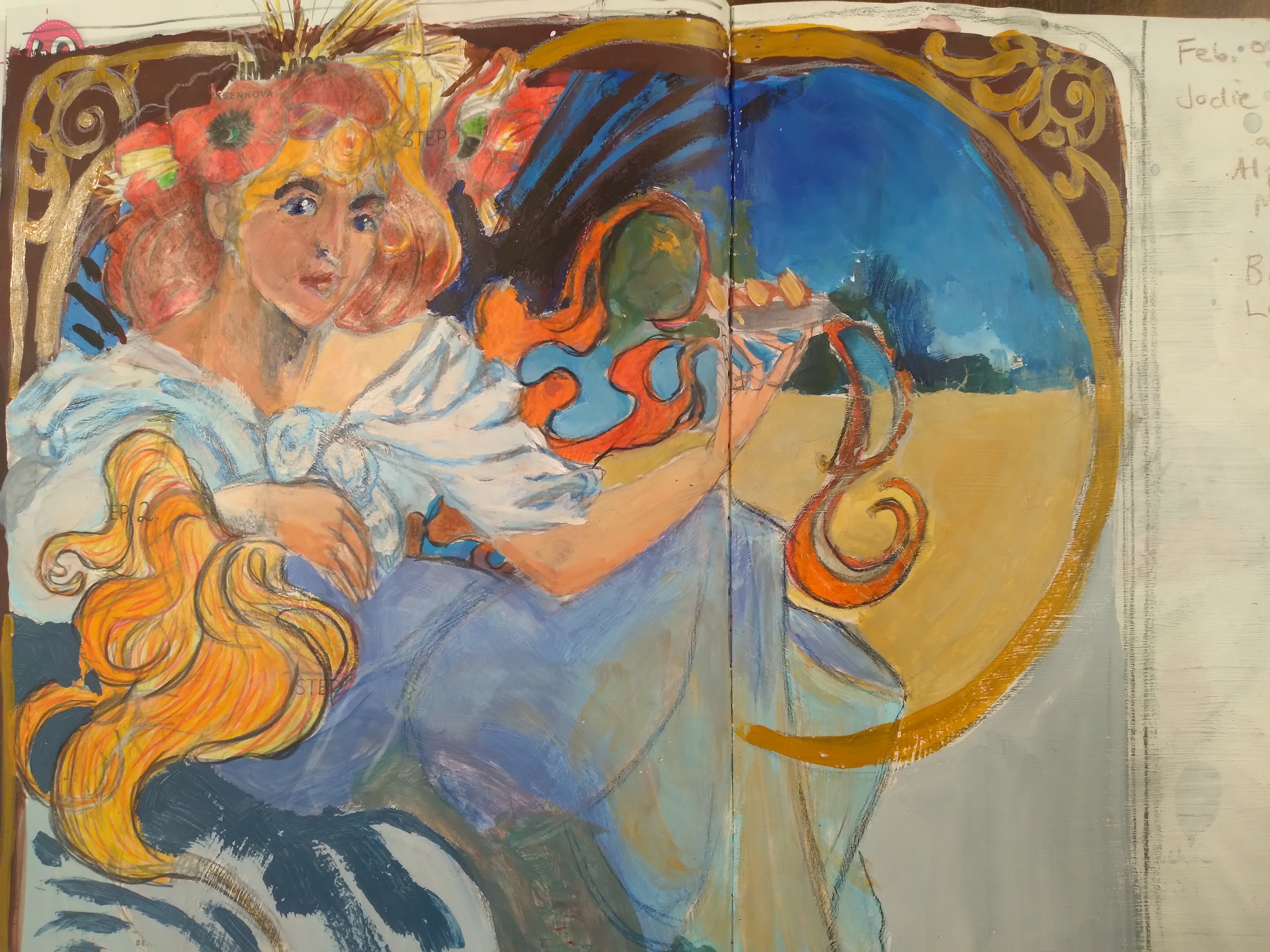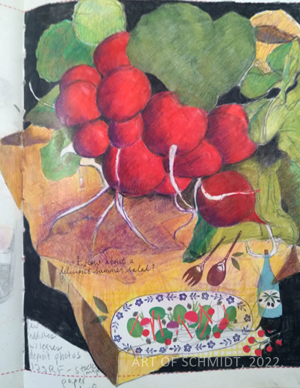Lillian Gish as Romola, Mixed Media, Jodie Schmidt, 2022. Jodie Schmidt, After Alphonse Mucha, Mixed media, 2022.Fruit Bowl Drawing, Colored pencil, Jodie Schmidt, 2022. Radishes with paper bag, Colored Pencil, Jodie Schmidt, 2022.