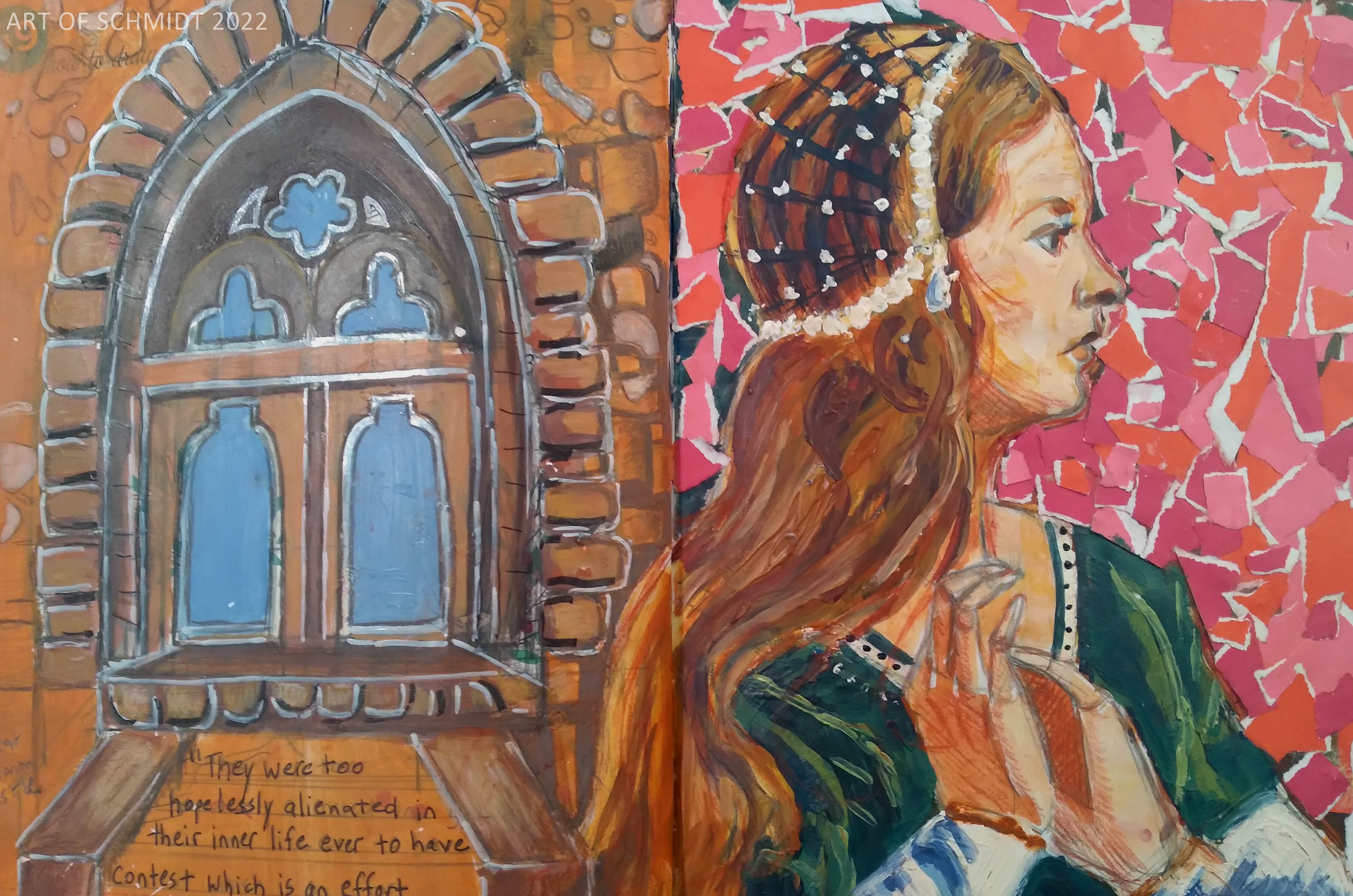Stage 4: I began composing this piece by moving elements of the collage back and forth until I was happy with them. Then I had to cut them all out and paste them to the masonite. I created an entirely new sketch for the self-portrait and painted it in oils instead of acrylic so I could get more working time to blend and smooth the edges.